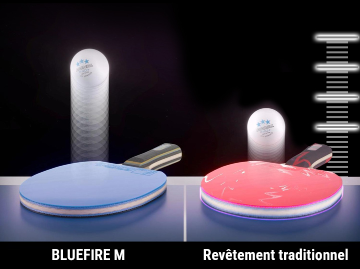 Les joueurs de topspin à mi-distance apprécieront le BLUEFIRE M. L'effet catapulte intensifié permet un jeu sûr et régulier loin de la table, même sous pression.